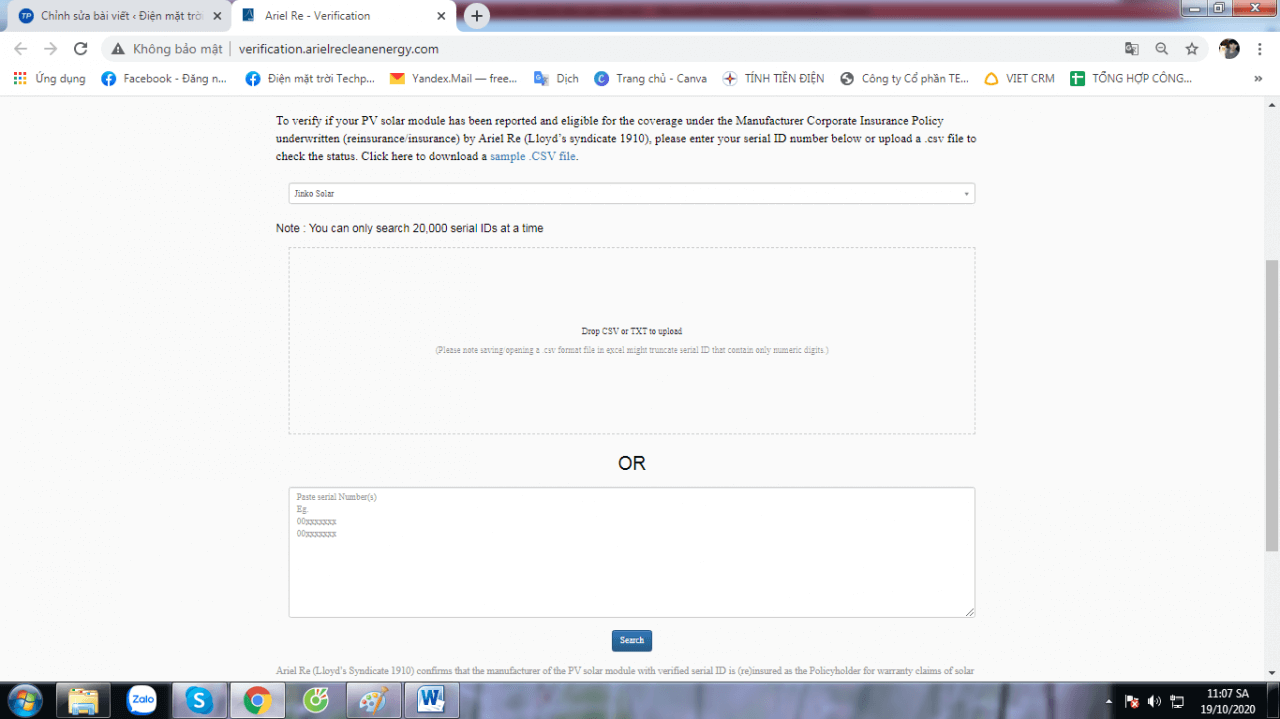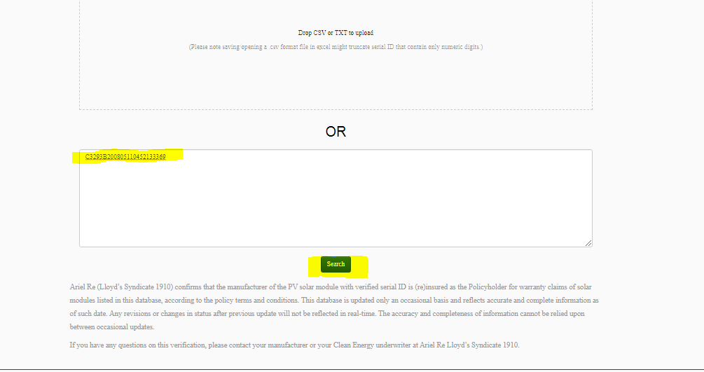 Nếu phải tra cứu nhiều tấm pin 1 lần mọi người tải file excel gồm các seri tấm pin lên phần “Drop CSV or TXT to upload”